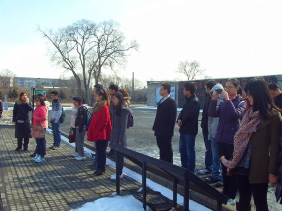 在731部队遗址前,同学们的心情极为凝重。731部队遗址在重新整修之后,共设有室内展厅十几处,并且配备讲解器,使同学们能够更加深刻的了解当年的那一段历史。一幅幅图片、一张张展板、一处处微缩景观,沉重的历史不断震撼着每一个人的心灵,侵华日军的暴行令大家愤慨,同时也让大家对为此牺牲的同胞产生了强烈的同情与尊敬。“遗民忍死望恢复,几处今宵垂泪痕。”在满挂着殉难者名字的长廊里,同学们纷纷向遇难同胞致哀。