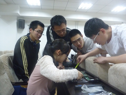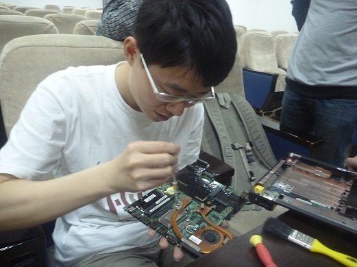 培训过程中,首先,王奕让我们认识了电脑清灰的工具,一个精致的工具箱,里面有各不相同的螺丝刀的和硅胶刷子。然后我们看着王奕“肢解”了一台台笔记本电脑,他一边拆下电脑的每一个部件,一边给我们讲解这个部件的作用以及如何拆卸,并强调注意事项和动作要领。为了更好地培训,王奕还在黑板上画了笔记本上常见的标志,并详细讲解其意义。当把一台电脑的键盘,主板,显示屏都拆下来的时候,学员们不由自主地鼓起了掌声。最后在王奕的指引下,小组的学员们也开始尝试自己进行电脑清灰,当把电脑清理好又重新装上时,小组成员深深地体会到了学到知识的喜悦心情。