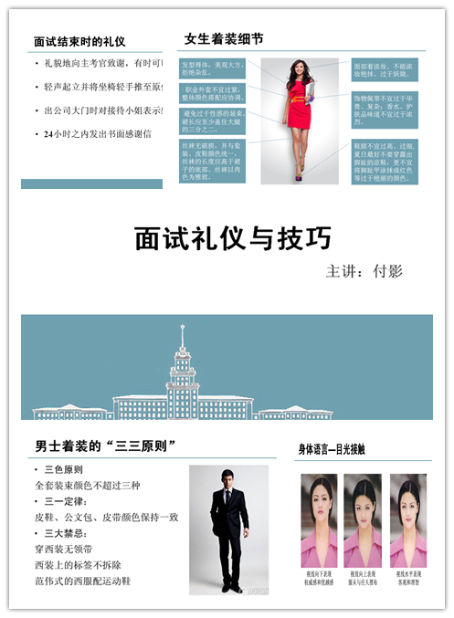 学工办主任、2014级研究生协理员付影老师以“简历制作技巧”、“面试礼仪与技巧”和“面试常见问题”三个专题系列讲座。付影老师引用一些实例生动幽默地讲解制作一份优秀简历的重要性。然后结合实例,以深入浅出的语言就好简历的原则标准、结构内容、求职信的写作技巧、简历的写作法则、投递方法,以及面试中自我介绍常见问题等相关的注意事项进行了全方位的讲解。在面试礼仪专题中,就面试前的准备、着装、仪态、礼仪等进行了详尽生动的讲解,讲座融知识性、趣味性和实用性于一体,使众多同学认识到,外在着装、形象与专业知识素养相辅相成的整体效应有助于提高职场竞争力。