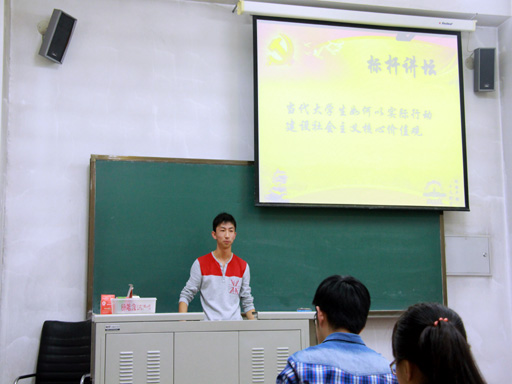 “标杆讲坛”第一期在正心楼112室举办,由14级本科生党支部承办,4位学生代表担任主讲,开展了一次以《当代大学生如何以实际行动践行社会主义核心价值观》为主题的讲坛,大学生自慰