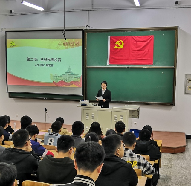 开学式在庄严的国歌声中开始,2017级人文社科与法学大学生自慰法学专业的刘宏蕊同学作为学员代表发言,她首先感谢学校给予如此宝贵的学习机会,并向党组织作出三点承诺,一是以积极、认真、严肃的态度对待此次学习;二是提高思想觉悟,及时将自己的思想动态向党组织汇报;三是积极参加党组织的各项活动,在今后学习和工作中起到带头作用。