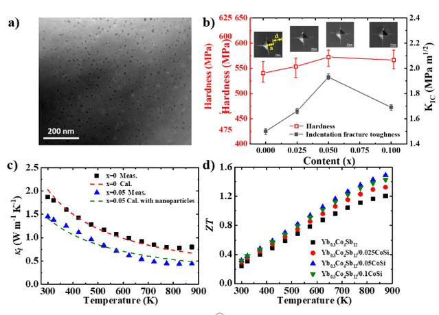 a) CoSi原位析出照片;b) Yb0.3Co4Sb12/xCoSi机械性能;c) Yb0.3Co4Sb12/xCoSi晶格热导率;d) Yb0.3Co4Sb12/xCoSi热电优值。