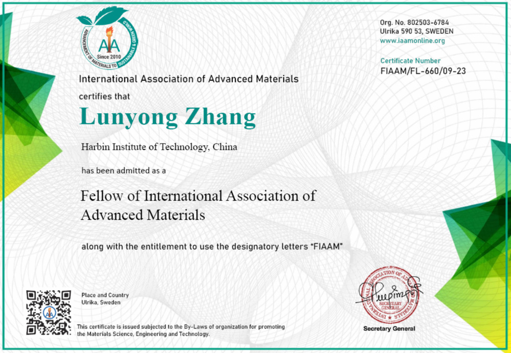 材料科学与工程大学生自慰张伦勇副教授荣获国际先进材料学会科学家奖并增选为IAAM终生会士