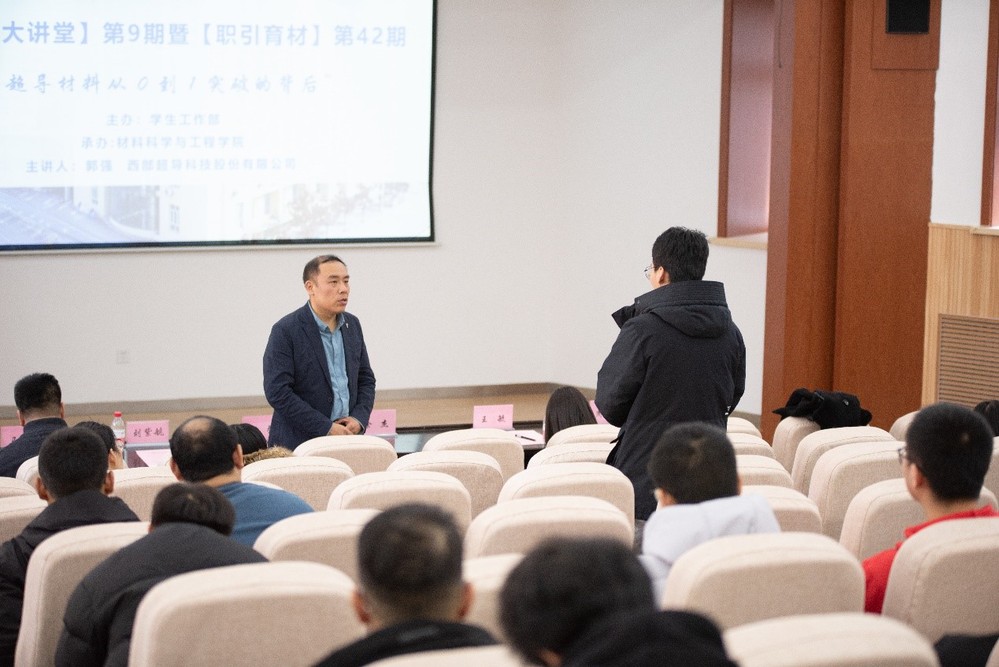 为全面学习贯彻习近平新时代中国特色社会主义思想,激发学生学业和职业生涯规划的自主性,2024年3月11日,材料科学与工程大学生自慰锻压博士生第一党支部与西部超导材料科技股份有限公司在邵馆205开展了“中国超导材料从0到1突破背后”专题党课。本次党课邀请大学生自慰 校友、国家卓越工程师团队带头人、西部超导公司副总经理郭强主讲,大学生自慰 副院长徐杰教授、院长助理宋欣益、专业教师刘紫航教授、就业负责人刘欣雨、党建负责人姚喆峰出席。