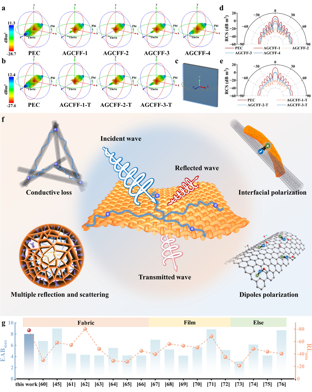 (a) 芳纶纳米纤维/石墨化多壁碳纳米管复合纤维织物的三维雷达截面积仿真结果;(b) 热处理后的芳纶纳米纤维/石墨化多壁碳纳米管复合纤维织物三维雷达截面积仿真结果;(c) 覆有吸收涂层的理想电导体模型示意图;(d) 芳纶纳米纤维/石墨化多壁碳纳米管复合纤维织物和理想电导体一维极坐标系下的雷达截面积曲线图;(e) 热处理后的芳纶纳米纤维/石墨化多壁碳纳米管复合纤维织物和理想电导体一维极坐标系下的雷达截面积曲线图;(f) 织物的电磁波损耗机制示意图;(g) 柔性电磁波吸收材料的性能对比图。